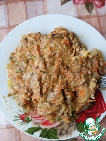 Добавляем к печени лук и морковь, жарим, помешивая, еще 5 минут.