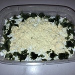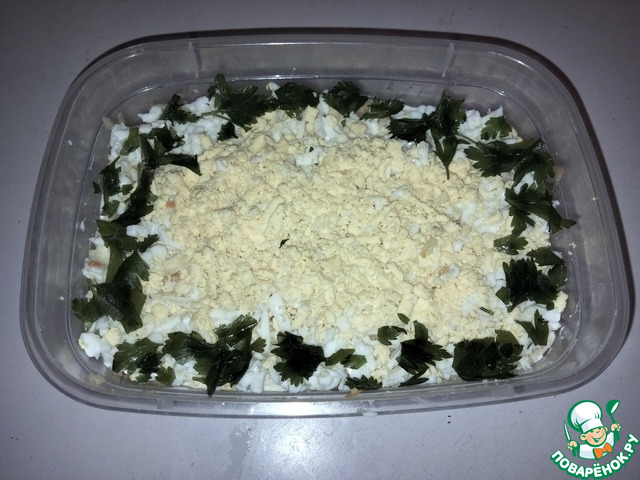 6 слой - натертые на крупной терке яйца (3 шт., одно отложить для украшения). Слой без майонеза.