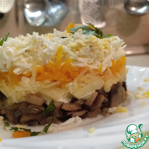 Этот салат делается слоями. Грибы и лук нарезать кубиками и обжарить вместе на растительном масле.