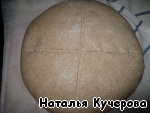 Разогреть духовку до 250 градусов. Сделать надрезы на хлебе. Можно крестом, можно по кругу, т. е., кому как нравится. Прямо с пекарской бумагой выкладываем хлеб на перевернутый противень и ставим выпекаться 5 минут. Затем убавляем температуру до 220 градусов и печем еще 25 минут.