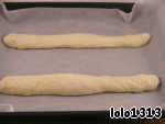 Затем разделить тесто на 4 части и сформировать хлебцы продолговатой формы - длинную трубку с закругленными концами, напоминающий багет.
