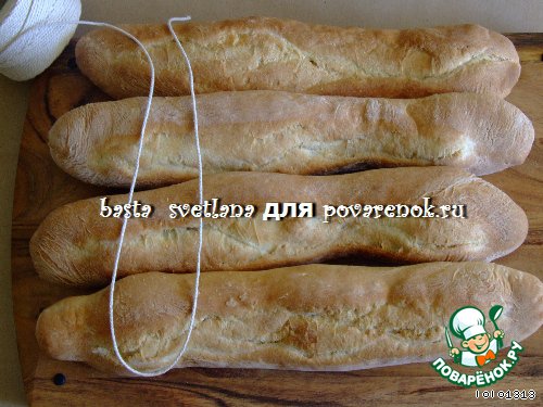 Влажный шпагат способствует раcколу (а точнее, разрыву) теста на месте соприкосновения и способствует неровному рисунку на хлебе, получается очень естественно и действительно, отличается от симметричных надрезов на батонах-багетах (обычно на тесто перед выпечкой наносятся надрезы ножом, этого в данном рецепте не делают). -