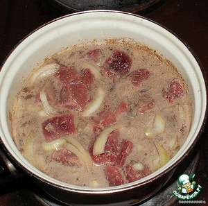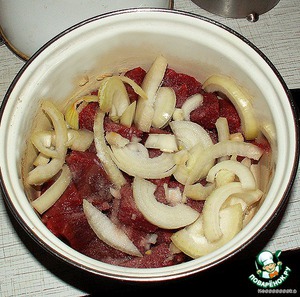 Кладем в сотейник мясо и лук, солим, перчим и наливаем 1-1,5 стакана воды. -