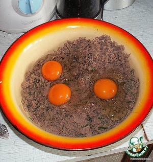 Мясо остужаем, проворачиваем на мясорубке. Добавляем перчик, яйца, порубленную зелень, перемешиваем.