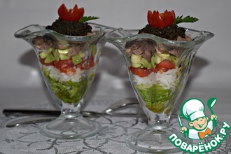 Летом отдыхали с мужем на море, как-то обедали в прибрежном кафе "Цезарь". Принесли меню, а мы оба, как назло, забыли очки в машине, идти лень, попросили официанта предложить что-нибудь фирменное. Он спросил о наших вкусах, я сразу сказала: "С языком". Тогда он и предложил этот салат. Очень понравился, конечно, технологию приготовления не расспрашивала, да и никто бы еe не рассказал, готовила по-своему.