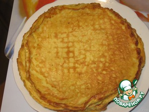 Взбить яйца, добавить муку, сметану, майонез, тертый сыр, соль. На растительном масле жарим тоненькие омлетики.