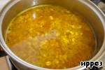 Добавить овсянку, перец, карри и паприку. Оставить кипеть на небольшом огне около 15 минут.