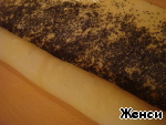 Дальше скручиваем первый пласт с маком. По шву немного раскатываем, чтобы тесто прилипло. Режем на части шириной 3 см.