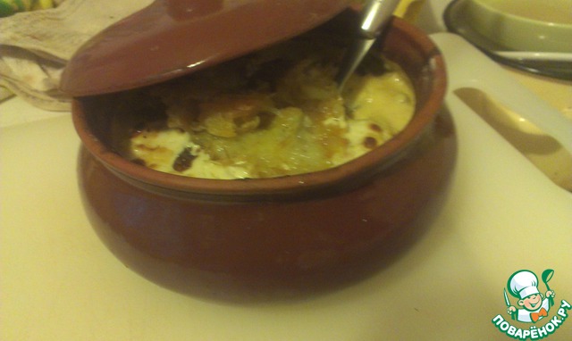 Приготовим стружку из картофеля. Натрем очищенный картофель на крупной терке. Отжать от лишней влаги, присолить, поперчить и обжарить на интенсивном огне в достаточном количестве растительного масла до хрустящего состояния. Достаем горшочки. Сверху в каждый выкладываем горкой картофельную стружку. Приятного аппетита!