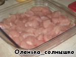 Куриное филе нарезаем небольшими кусочками и складываем в огнеупорную посуду.