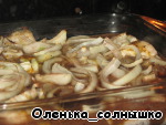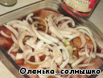 Посыпаем специями (у меня карри, смесь перцев, грибы сушеные с травами и морской солью), сверху выкладываем лук полукольцами и заливаем вином. Оставляем мариноваться хотя бы на пол часа, если вы делаете этот шаг, как я, сильно заранее, то накрываем пленкой или фольгой.