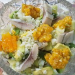 Перемешать сельдь, авокадо, яблоко, огурцы, белок, лук и рис.