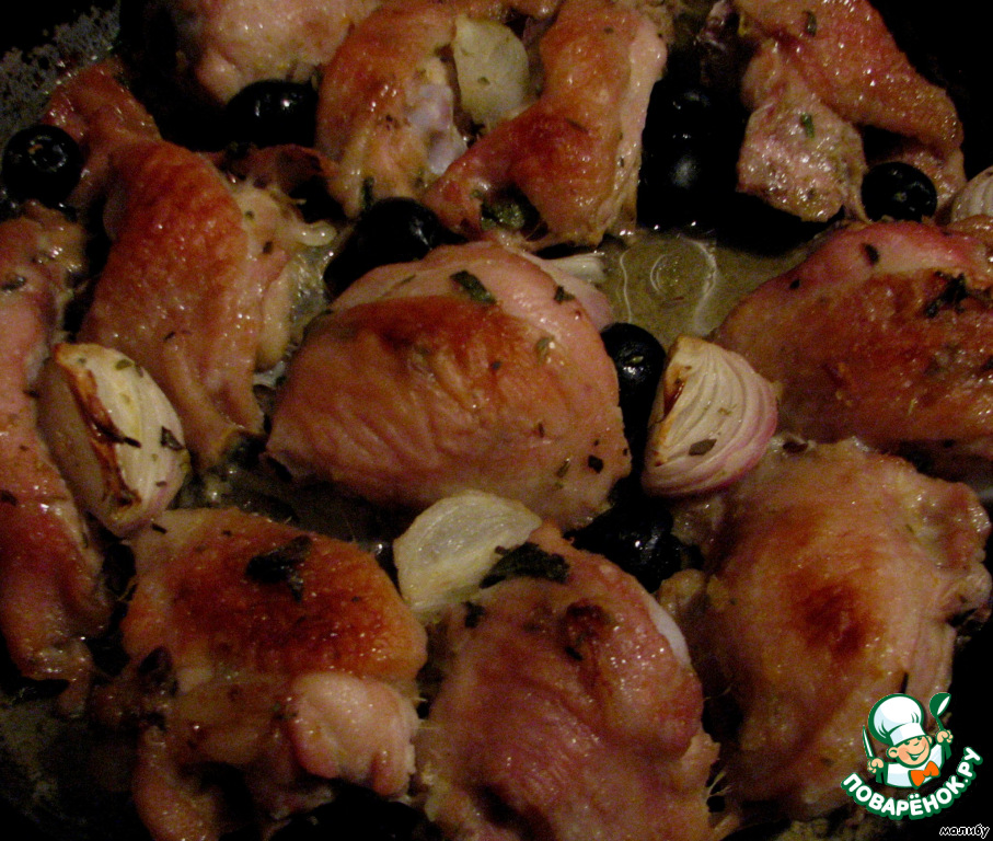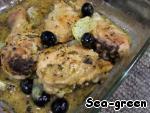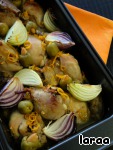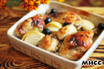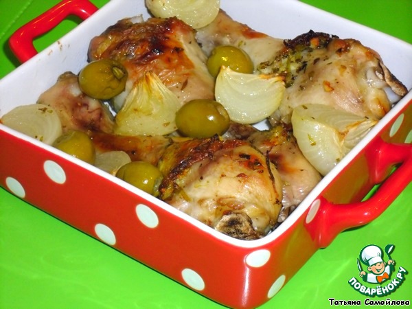 Форму для выпечки слегка смажьте и переложите в нее курицу и маринад. Сверху выложите лук и оливки.