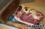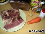 Мясо моем, слегка солим. Можно замариновать на полчасика в вине, пиве или квасе. А можно обмазать сразу горчицей и поперчить. Чистим морковь и чеснок. Нарезаем и шпигуем мясо тонкими полосками с помощью ножа. Я еще сверху обмазала чесночком, выдавленным через пресс.