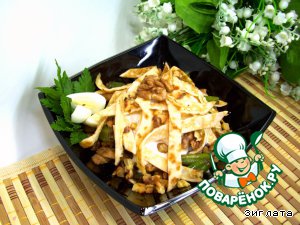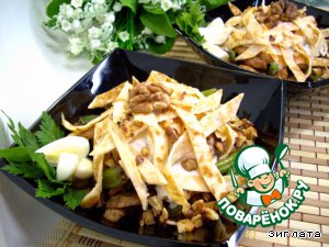 Теперь прикрыть салат остатками омлетных блинчиков и, по желанию, украсить грецкими орехами, зеленью, перепелиным яйцом.