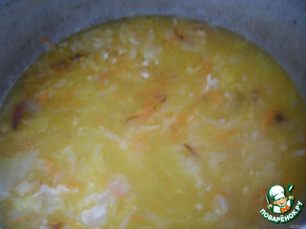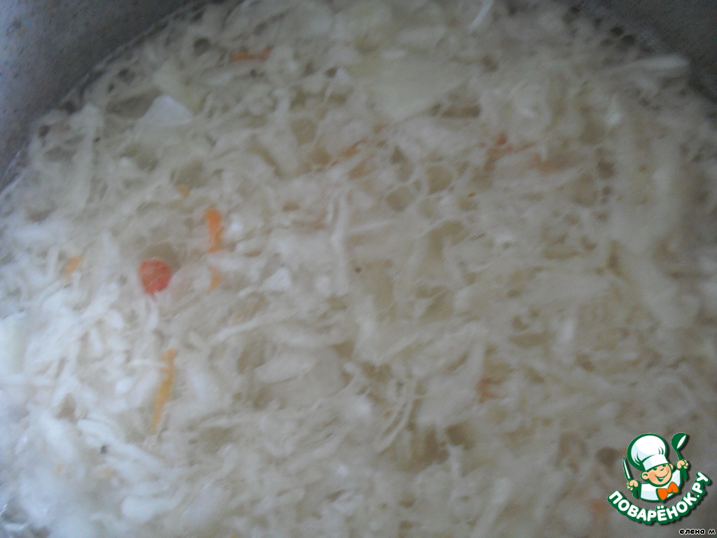 Положить капусту в кипящий бульон (воду), варить на медленном огне до мягкости капусты (около 1,5 часов). -