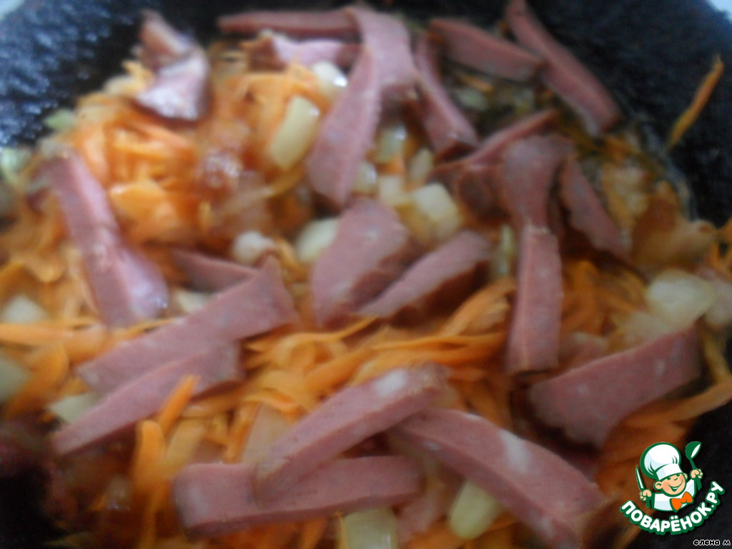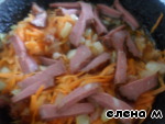 Когда лук зарумянится, добавить нарезанную брусочками или кубиками копченую колбасу.