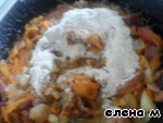 Когда колбаса обжарится, добавить муку, перемешать.