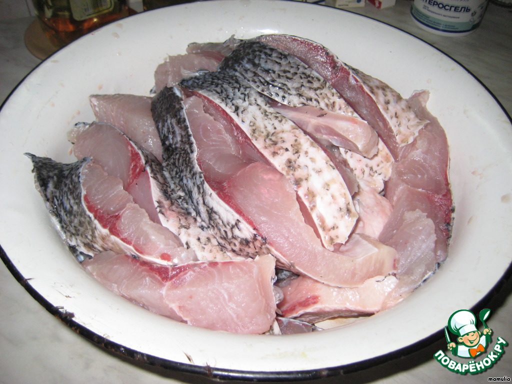 Крупную рыбу почистить, помыть, отделить голову и хвост (на уху), разрезать по длине (отделить кость), порционно разделить на кусочки по 3-4 см. Посолить, поперчить, дать просолиться 10-15 минут.