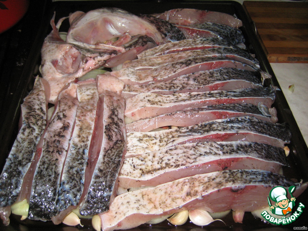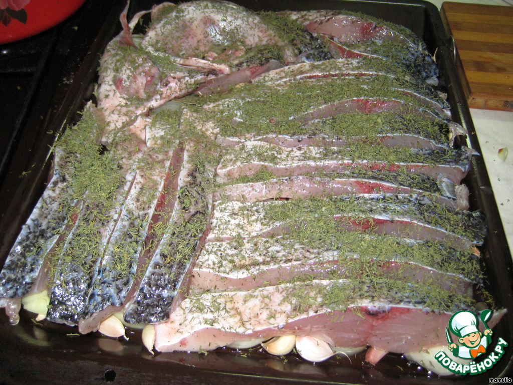 Очень простой и удивительно вкусный рецепт, любимое блюдо моей семьи. Рыбка выходит сочная, нежная, "уничтожается" очень быстро. Вкусна как в горячем, так и в холодном виде. Чеснок и лук со дна противня вместе с соком съедается быстрее рыбы, причем детьми. Для приготовления этого блюда использовала крупную рыбу (3 -4 кг): пеленгас, толстолобик, короп. Главное, не передержать в духовке.