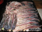 Противень обильно смазать растительным маслом, уложить лук репчатый, нарезанный кольцами, чеснок (зубцы в кожуре).