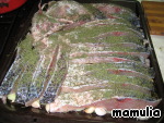 Сверху уложить плотно рыбу, между кусочками положить лавровый лист.