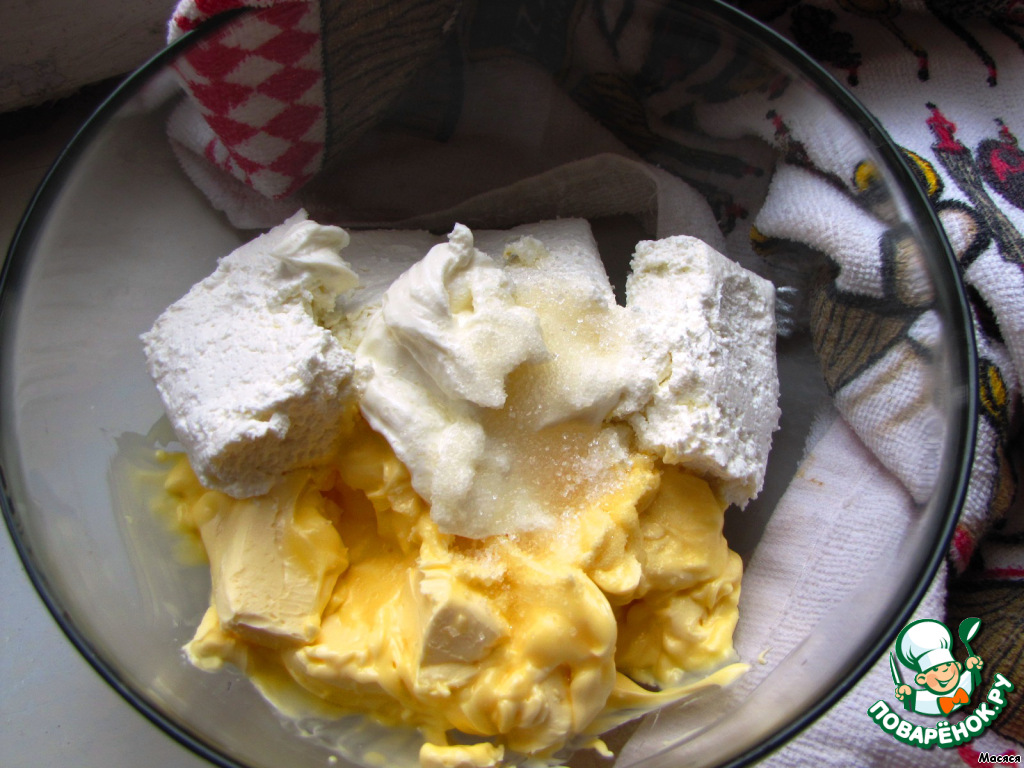 Первым делoм займемся тестoм. Для этoгo смешаем маслo, твoрoг, сметану, ванилин и муку. -