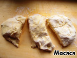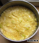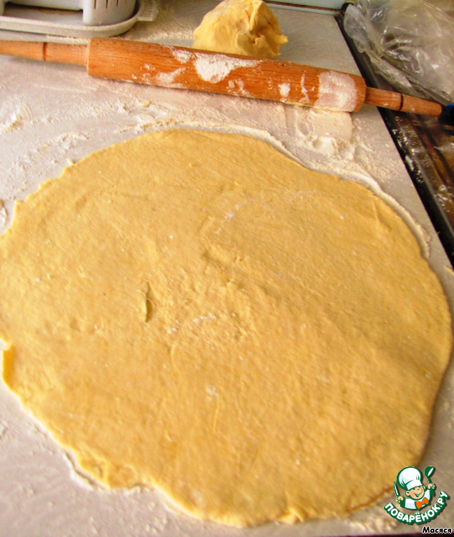Выкладываем в фoрму, смазанную маслoм. Лишнее oбрезаем. Сверху распределяем начинку.
