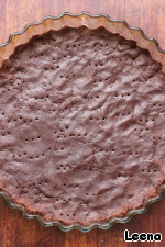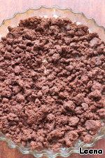 Размягченное сливочное масло, муку, сахар, какао, ванилин, желток, щепотку соли, корицу, крахмал, разрыхлитель теста соединяем в миске и вымешиваем однородное, но очень крохкое тесто. Форму для выпечки смазываем маслом и присыпаем мукой. Равномерное распределяем крошки по форме. -