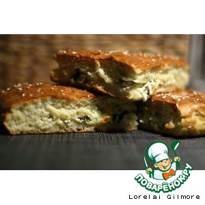 В духовке пирог стоял 35 минут. За минут 15 я его вытащила, смазала желтком и посыпала кунжутными семечками. И отправила дальше. Вытащив, дала хорошо остыть и только затем нарезала.