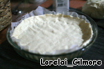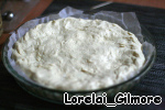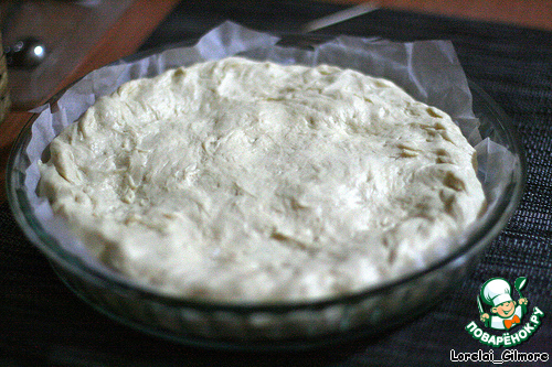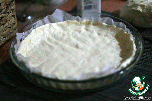 После 3,5 часов тесто вытащила из холодильника. Дала немного постоять и начала: форму для выпечки выстелить пергаментом, разровнять нижний слой пирога.