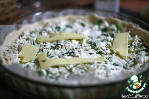 Тесто должно подниматься под бортики, немного позже нам его залеплять. Выложила начинку и сверху положила кусочки сливочного масла.