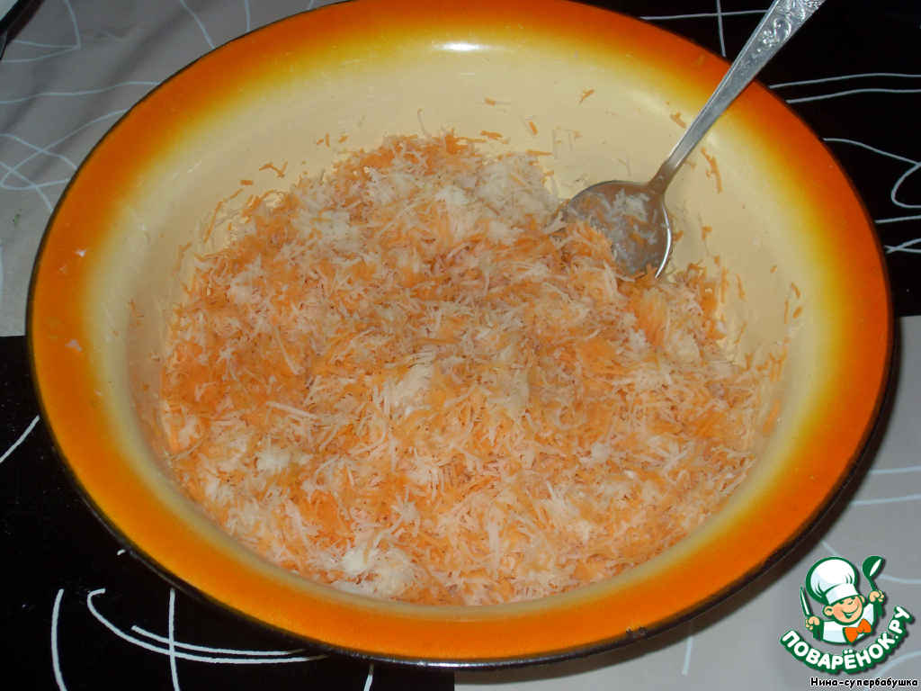 Редьку и морковь очистить и натереть на мелкой терке. Если они слишком сочные, немного отжать лишний сок, чтобы салат не плавал. |