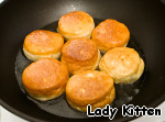 В большую сковороду налить растительное масло и обжарить пончики с двух сторон до золотистого цвета.