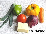 Все овощи моем и чистим. Морковь трем на терке, остальное режем небольшими кубиками. Сыр трем на терке и делим на 3 части. Обжариваем отдельно помидоры с красным луком, желтый перец с морковью, зеленый перец с пореем. Смешиваем с сыром каждую зажарку.