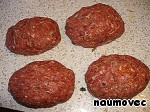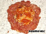 Делаем мясной фарш на котлеты. Проворачиваем через мясорубку мясо, замоченный в воде и отжатый мякиш, солим по вкусу. Добавляем яйцо, все тщательно перемешиваем. Делим полученный фарш на 4 части, а каждую часть еще на 4. Берем одну часть фарша, лепим из нее лепешку. Выкладываем на лепешку помидорную смесь.