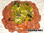 Накрываем третьей лепешкой из фарша, выкладываем смесь с зеленым перцем.