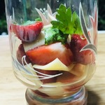 Нежность моцаррелы, сладость меда и клубники, острота перцев, кислинка лимона... Смешение всех вкусов в одном бокале. Отлично дополнит вкус сухого шампанского или белого вина.