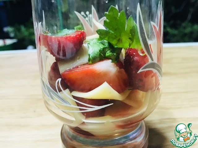 Нарезать на небольшие кусочки моцареллу и клубнику. Аккуратно переложить смесь в бокалы, полить заправкой, украсить кинзой. Убрать в холодильник на полчаса.