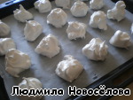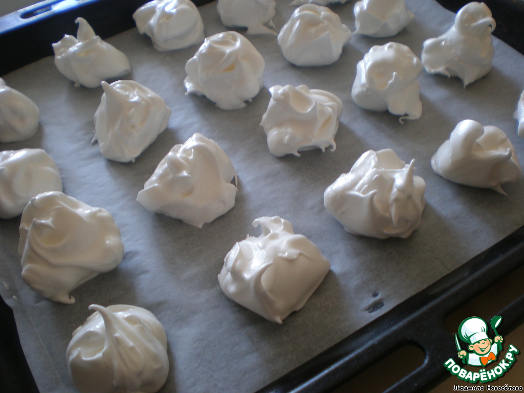 Взбить белки с сахаром до пиков и выложить чайной ложкой на противень, застеленный пищевой бумагой. Поставить в духовку на 2 часа при температуре 130 градусов.
