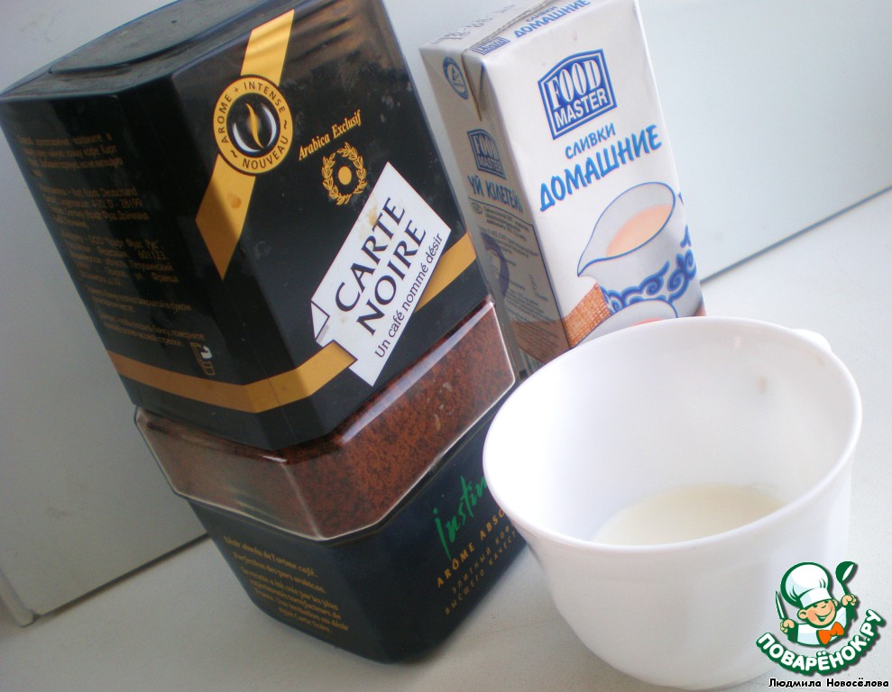 Подогреваем сливки (молоко или воду) и разводим растворимый кофе.