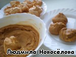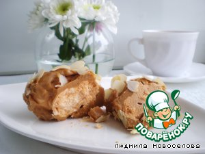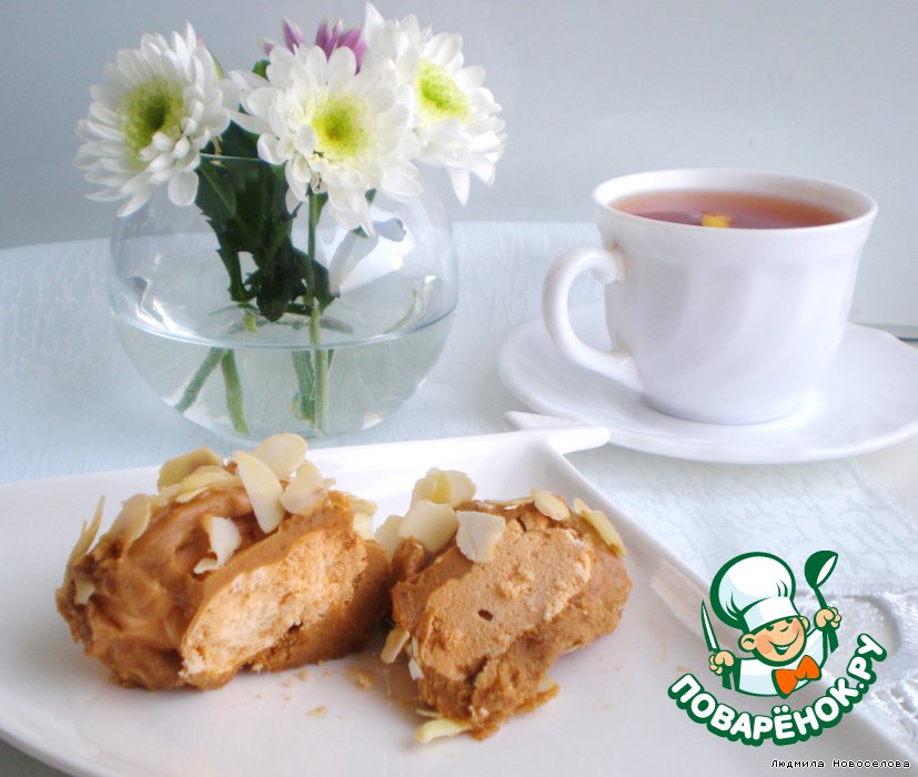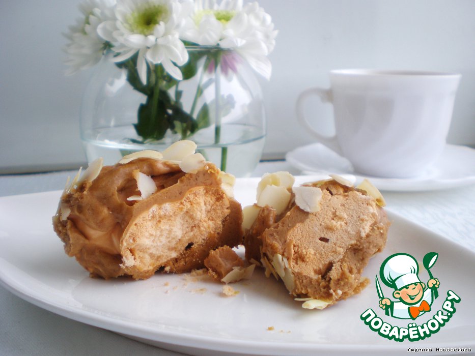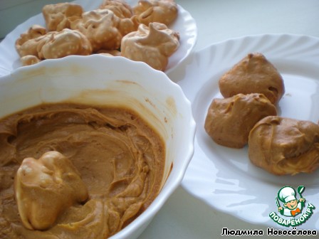 Наши испеченные безе обмакиваем в кофейный крем и выкладываем на тарелочку друг к другу. Сверху обмазываем кремом, посыпаем орешками.