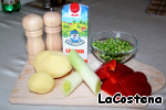 Нам понадобится: картофель, лук-порей, красный сладкий перец, замороженный горошек и сливки.