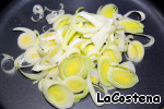 Лук-порей нарежем кольцами и выложим на сковороду.