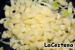 Картофель нарежем кубиками и добавим к луку. Жарим без масла около 5 минут. Помешиваем.