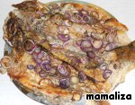 Разрезать рыбу вдоль хребта по спине. Разложить ее, вывернув наизнанку. Слегка присолить. И чуть-чуть присыпать специями для рыбы. Лук почистить, разрезать кольцами и выложить сверху на рыбу. Все!