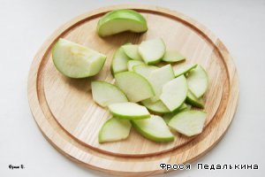 3.Из яблока удалить сердцевину и семена, разделить на 4 части и нарезать на тонкие ломтики. В оригинале кожицу снимают, я оставила.
