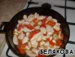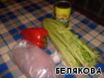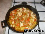 В разогретое растительное масло бросаем сладкий перец, немного обжариваем и добавляем куриное филе. Думаю, подойдут и кусочки курицы...