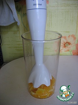 Третий апельсин очистить от кожуры, порезать на мелкие кусочки, удаляя косточки, измельчить в блендере.