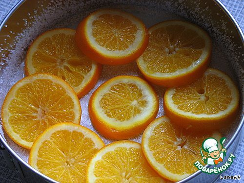 Форму диаметром 26 см застелить пекарской бумагой (можно и без нее, но я решила подстраховаться). Смазываем маслом, обсыпаем сахаром, так чтобы он покрыл дно и стенки формы. Излишки высыпать. На дно формы выкладываем внахлест сваренные в сиропе апельсины. -
